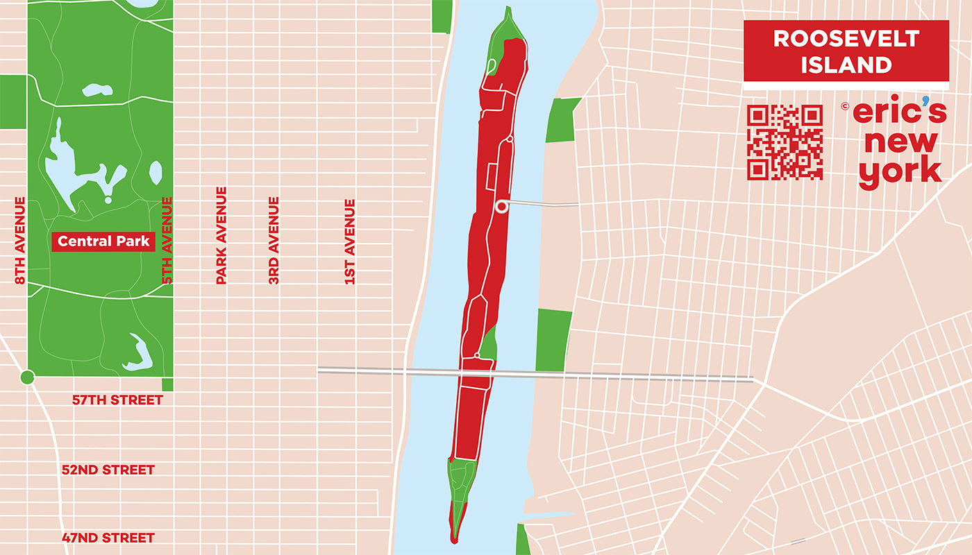 O jeito mais divertido de chegar na Roosevelt Island a partir de Manhattan é pegando o Roosevelt Island Tram. Nesse teleférico você terá uma vista ótima da cidade e o trajeto leva cerca de três minutos. Você pode até usar seu MetroCard. Você tem um Unlimited Ride MetroCard? Então a viagem é praticamente gratuita! Na volta, o jeito mais rápido para chegar em Manhattan é o metrô. Entretanto, é mais agradável pegar a NYC Ferry e admirar a vista para o horizonte. Você alugou bicicletas para passar algumas horas pedalando pela cidade? Você pode levá-las consigo na balsa! Pelo valor adicional de $1, você pode levar sua bike na NYC Ferry e pedalar pela Roosevelt Island.